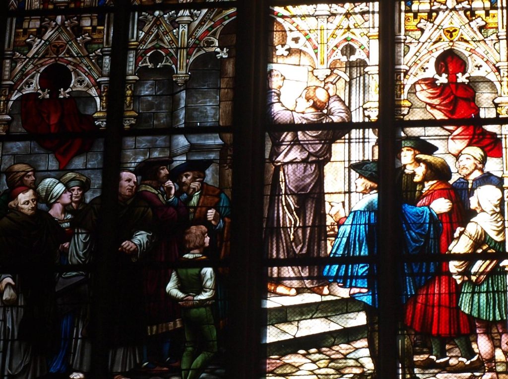 Und in dieser Gemengelage nimmt nun der mit sich besonders strenge Augustinermönch Martin Luther Anstoß weniger an den moralischen Verfehlungen der Kirche, sondern mehr noch an den theologischen Ungereimtheiten. Der Protest gegen den Ablass, dass Menschen sich gegen Geld von Sündenstrafen freikaufen können, machte den Anfang. Durch die Widerstände und den Ketzerprozess, in den er immer mehr hineingezogen wurde, reifte in Luther dann schnell, was er in seinem Bibelstudium und in seinen Vorlesungen an der Universität in Wittenberg schon theoretisch angedacht hatte. Das Urteil lag nahe, dass sich die Kirchenstruktur zementierend auswirkt und der Anspruch der Kirche, notwendige Heilsvermittlerin zu sein, nicht aufrecht erhalten werden kann. Dies hat Luther ohne Rücksicht auf die für ihn möglichen Folgen durchgefochten. Schnell hatte er Anhänger gefunden. Mit Hilfe der neuen Drucktechnik Gutenbergs vervielfältigten sie seine Schriften, die sich in ganz Europa verbreiteten. Der später in Genf wirksame Johannes Calvin kam beispielsweise schon früh in Paris mit ihnen in Berührung.